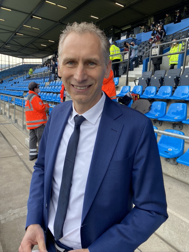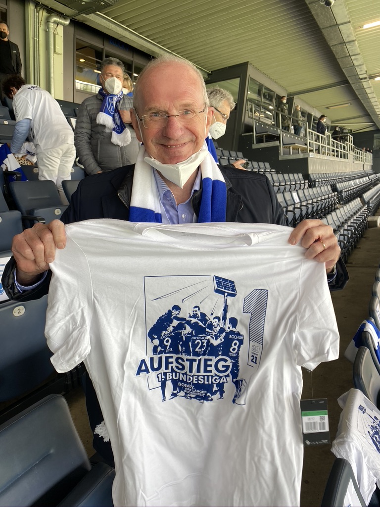 Bochums Herbie-Hymne läuft im Hintergrund aus. Schaut euch das VfL Glück an…Die Meistermedaillen werden von Ex-Profi Patrick Fabian an jeden einzelnen Spieler höchstpersönlich verteilt.Seit dieser Saison ist er als Assistent der Geschäftsführung/Sport aktiv und untersützt so Sebastian Schindzielorz.Im Hintergrund freuen sich die VfL Spieler, Coach Reis -nicht zum letzten Mal an diesem Tag- mit Fiege Bier zu erfrischen. Der Trainer hat überhaupt nichts dagegen.Ja, ich habe sie endlich. Und jeder soll sie sehen. Meine Medaille. Thomas Reis glücklich. Er und sein Trainerteam haben maßgeblichen Anteil, an dem Aufstieg des VfL. Aus vielen schwierigen Charakteren hat er eine echte Einheit geformt. Achja, ich habe da noch etwas, was ich Euch Fans gerne zeigen möchte. Den offiziellen Meisterwimpel der 2. Bundesliga 2021.Bekanntes, sympathisches Gesicht. Ansgar Schwenken (2003 bis 2014 Vorstand des VfL Bochum und verantwortlich für die Bereiche Finanzen und Organisation) durfte in seinem alten Zuhause die „Meisterschale“ an die Bochumer übergeben. Seit November 2015 ist er bei der DFL als Direktor-Fußball-Angelegenheiten und Fans aktiv. Weiterhin wohnt er und seine Familie in Bochum. Den Job in der Zentrale in Frankfurt erledigt Anskar Schwengen, indem er pendelt und eine kleine Wohnung in Frankfurt besitzt. „Ich freue mich sehr, dass ich heute diesen tollen Job hier erledigen kann“, erzählte er direkt vor der Übergabe der „Schale“.VfL Boss Villis nimmt Coach Reis kurz nach dem Abpfiff fest in den Arm und gratuliert ihm. Im Hintergrund; Club Legende Ata Lameck.Man sieht VfL Boss Hans-Peter Vills die Erleichterung und Freude an. Stolz zeigt er die eigens für den Aufstieg produzierten Shirts an. Das „Final-Foto“. Alle Bochumer haben ihre Sieger-Shirts an. Dazu hat jeder eine Medaille um. Alle schreien ihr Glück in diesem Moment heraus. Der Himmel ist in diesem Moment übrigens: BLAU-WEISS. Zufall?!Mhhh. Simon Zoller leert sein Fiege-Pils über Manager Schindzielorz aus. So richtig glücklich sieht der Ex-Profi (noch) nicht aus. Simon Zoller ist das aber egal 🙂Wer die Schale in der Hand hat, hat heute immer Recht.Die gute Laune ist bei Schindzielorz aber schnell zurück. Professionell wird SKY im Interview bedient. Zwar ist jetzt alles nass. Ist aber auch wurscht.Heute ist fast alles erlaubt.